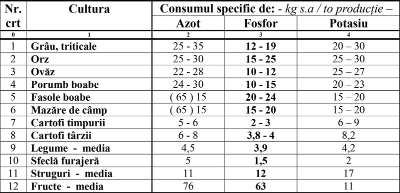 Realizarea unor producții agricole vegetale mulțumitoare nu se poate face fără aport extern de substanțe nutritive, fie ele sub formă de gunoi de grajd bine compostat, fie sub formă de fertilizanți chimici. Aceștia se aplică etapizat, începând cu aplicarea de bază, la pregătirea patului germinativ și continuând cu cele faziale, după răsărirea plantelor de cultură. Pentru producerea unei tone de producție principală, împreună cu producția secundară aferentă acesteia, culturile agricole extrag din sol cantități însemnate de substanțe chimice denumite elemente nutritive. Redăm în tabelul de mai jos consumurile specifice de elemente nutritive pentru principalele culturi agricole specifice Gorjului.