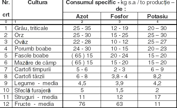 Pentru producerea unei tone de producție principală, împreună cu producția secundară aferentă acesteia, culturile agricole extrag din sol cantități însemnate de substanțe chimice denumite elemente nutritive. Redăm în tabelul de mai jos consumurile specifice de elemente nutritive pentru principalele culturi agricole specifice Gorjului.