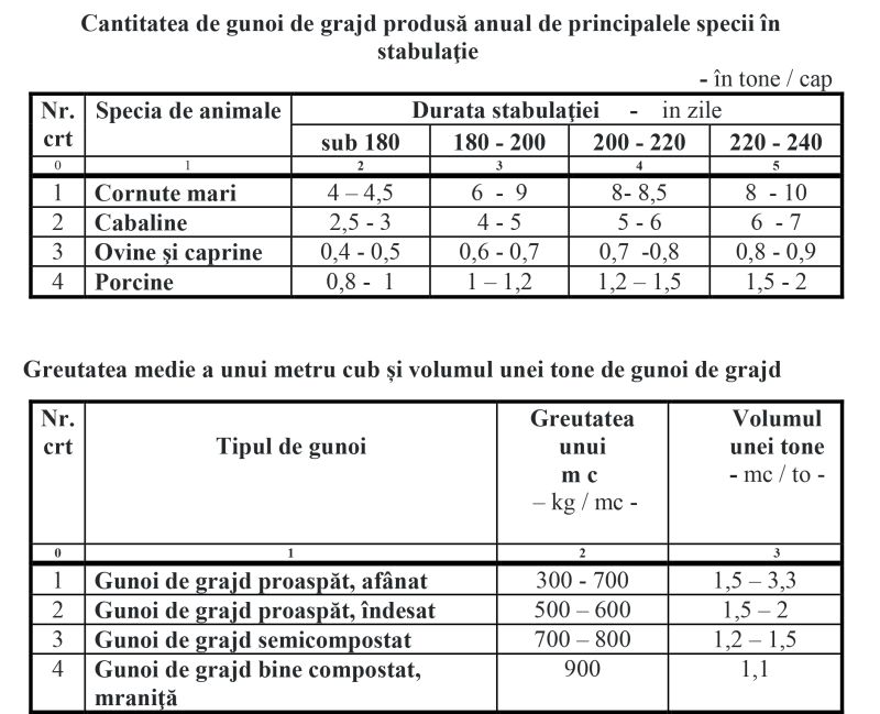 Notă: Pentru aprecierea cantității de bălegar produsă într-un an se înmulțește greutatea animalului cu următorii coeficienți: pentru boi și vaci – 27, pentru cabaline – 22,pentru porcine – 30.