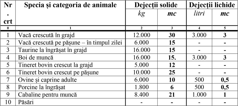 c – estimarea spațiului necesar depozitării gunoiului de grajd se face în funcție de numărul de animale, utilizând valoarea producției zilnice de gunoi (inclusiv așternutul) pe cap de animal și volumul lunar al gunoiului care trebuie stocat pe cap de animal;