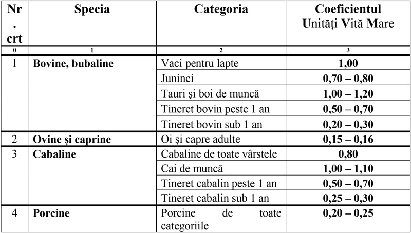 Coeficienții de transformare în U M V a diferitelor specii și categorii