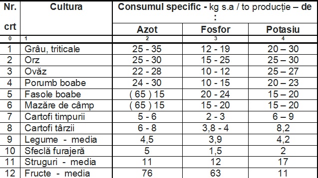 Iarna neobișnuit de călduroasă până acum a favorizat continuarea vegetației cerealelor de toamnă chiar la intensitate mare ceea ce a condus la extragerea din sol de cantități sporite de elemente nutritive și deci se impune mai mult ca oricând completarea acestora prin fertilizare fazială în acest timp. Pentru producerea unei tone de producție principală, împreună cu producția secundară aferentă acesteia, culturile agricole extrag din sol cantități însemnate de substanțe chimice denumite elemente nutritive. Redăm în tabelul de mai sus consumurile specifice de elemente nutritive pentru principalele culturi agricole specifice Gorjului.