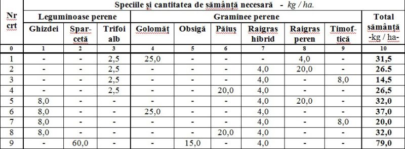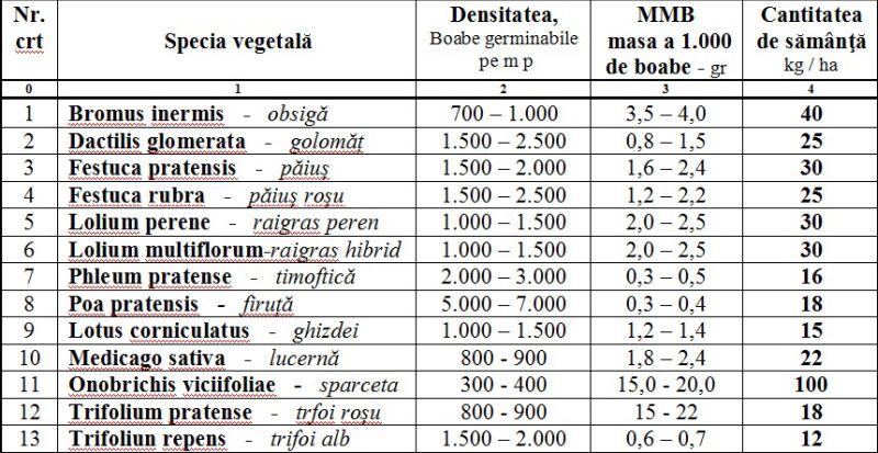 Notă: – Densitatea și norma de sămânță de mai sus sunt stabilite pentru cultură pură. Pentru amestecuri perene aceste cantități se reduc la procentul de participare al fiecărei specii în amestecul respectiv.