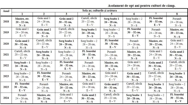 În exemplul de față în fiecare pătrățel este înscrisă cultura, cu sau fără anul de staționare, arătura ca adâncime (20 – 25 cm), precum și ca direcție de executare ( Nord – Sud sau Est – Vest ). În mod asemănător trebuie procedat și pentru celelalte elemente de agrotehnică ce vor face obiectul asolamentului.