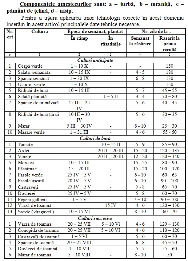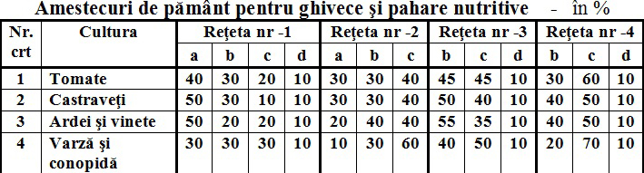 Atât producătorii, cât și consumatorii de legume își doresc apariția cât mai timpurie a celor proaspete și dacă se poate, și trebuie să se poată, la prețuri rezonabile, benefice și pentru unii și pentru ceilalți. Desigur că acest lucru reclamă eforturi fizice și materiale suplimentare, ceea ce se reflectă în prețul de pe piață. Mi-aș permite să recomand consumatorilor să prefere produsele autohtone, chiar mai puțin aspectuoase, celor foarte fercheșe din import, dar vectori purtători de substanțe toxice sau agenți patogeni, ceea ce va supăra sigur în timp ficatul nostru, și numai pe el. Este bine de știut că, multe din aceste substanțe descoperite în legumele și fructele din import au chiar un pronunțat efect cancerigen la oameni. Să mai continuu explicitarea acestui lucru? Pentru a oferi pieței produse mai sigure, sănătoase și producătorii lor trebuie să nu se mai lase impresionați de aspectul și productivitatea celor din import, căci acestea sunt dublate de efectele nocive descrise mai sus. Din fericire, știința agricolă românească a creat la toate plantele de cultură din țara noastră soiuri și clone valoroase, bine adaptate condițiilor pedoclimatice locale, dar din păcate pentru mulți dintre noi,, găina străinului e mai curcă decât a noastră”. Cine are urechi de auzit… Recomand așadar producătorilor de răsaduri și legume utilizarea soiurilor românești, iar consumatorilor cumpărarea acestor produse chiar dacă cele străine încântă mai mult ochiul și să nu uite că produsele consumate azi te pot îmbolnăvi irecuperabil mâine. Imediat ce zăpada se topește este timpul să instalăm răsadnițele încălzite cu biocombustibil, cât și solariile, închiderea etanșă a acestora spre a provoca încălzirea rapidă a solului din ele și răsărirea primei tranșe de buruieni a căror distrugere este ușoară și se face o dată cu pregătirea terenului pentru semănat sau plantat, fără cheltuieli suplimentare. Sunt foarte utile în producerea răsadurile cuiburile nutritive pe bază de turbă și amestec nutritiv special. Redăm în continuare și câteva rețete de amestecuri nutritive pentru aceasta. (Va urma)