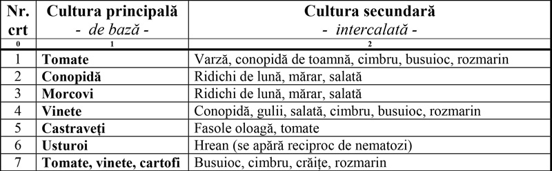 6 – Asocierea culturilorcare presupune intercalarea printre rândurile culturii de bază a unor culturi sau plante care, mai ales prin uleiurile eterice pe care le emană, tulbură sistemul de orientare al unor dăunători, și astfel îi îndepărtează pe aceștia de plantele de cultură. Astfel, printre rândurile de cartofi, tomate, ardei, vinete se plantează cimbru, busuioc, lavandă, măghiran, mentă,  pentru îndepărtarea gândacilor din Colorado, ori  hrean prin cultura de usturoi pentru alungarea nematozilor acestuia. De asemenea se inserează prin toate culturile legumicole rânduri  de crăițe (Tagetes spp.) pentru îndepărtarea viermilor sârmă din sol. Redăm în tabelul de mai jos un model de asociere a plantelor legumicole, cu precizarea că această asociere se practica la noi „din negura vremilor” fără explicații științifice, dar cu efecte majore în protejarea recoltelor.