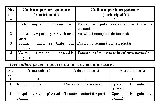 În legumicultură, mai ales pe micile grădini familiale, se pot obține 2 sau chiar 3 recolte pe an prin culturi anticipate, de bază și succesive. Pentru aceasta terenul trebuie să fie puternic fertilizat cu gunoi de grajd bine fermentat și asigurată apa din abundență spre a susține obținerea acestor recolte. Redăm o structură de culturi legumicole pentru a realiza două recolte pe an.