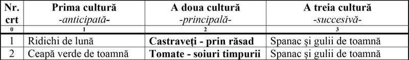 În legumicultură, mai ales pe micile grădini familiale, se pot obține 2 sau chiar 3 recolte pe an, prin culturi anticipate, de bază și succesive. Pentru aceasta terenul trebuie să fie puternic fertilizat cu gunoi de grajd bine compostat și asigurată apa din abundență, spre a susține obținerea acestor recolte. Redăm o structură de culturi legumicole pentru recolte multiple.