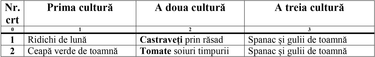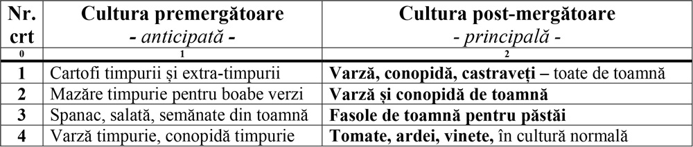 În legumicultură, mai ales pe micile grădini familiale, se pot obține de pe aceeași suprafață 2 sau chiar 3 recolte pe an prin culturi anticipate, de bază și succesive. Pentru aceasta terenul trebuie să fie puternic fertilizat cu gunoi de grajd bine compostat și asigurată apa din abundență, spre a susține obținerea acestor recolte. Redăm o structură de culturi legumicole pentru recolte multiple.
