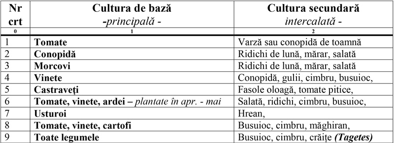 Pentru a susține și simplifica combaterea bolilor, buruienilor și dăunătorilor în legumicultură, mai cu seamă în grădinile familiale, se recomandă asocierea mai multor culturi alături de culturile de bază, fără a reduce producția acestora, ba chiar aceasta va spori și mai ales va necesita un consum mai redus de pesticide.