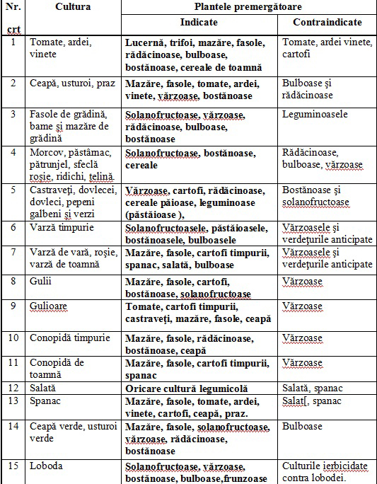 În cultura plantelor, deci și a legumelor, un factor foarte important în obținerea de recolte bogate și mai ieftine îl constituie planta premergătoare. Ea poate fi o puternică sursă de boli, buruieni sau dăunători, este cazul plantelor contraindicate, sau o sursă de condiții favorabile, este cazul premergătoarelor indicate, care pot spori volumul și calitatea recoltelor.