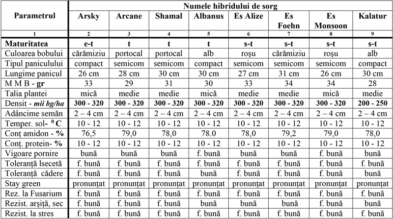 Cei mai promovați hibrizi de sorg pentru boabe de la noi sunt cei marca LIDEA ale căror principale particularități culturale le prezentăm în tabelul următor: