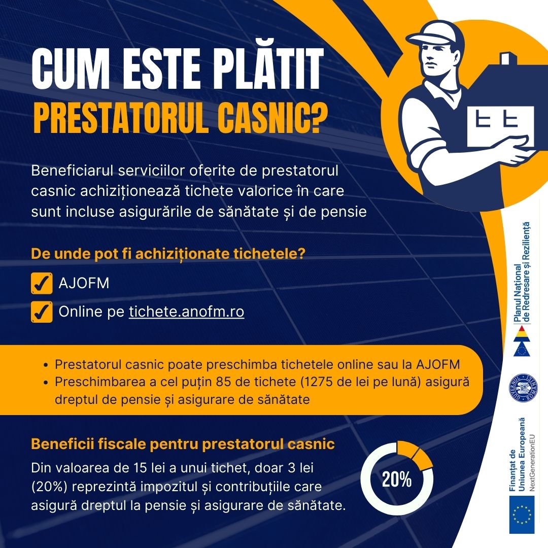 Sistemul funcționează simplu: beneficiarul cumpără tichete de la AJOFM Gorj – fie de la sediu, fie online –, iar prestatorul le primește pentru activitatea prestată. Ulterior, tichetele pot fi transformate în numerar, iar în paralel, prestatorul beneficiază de contribuții recunoscute la pensie și sănătate, în funcție de numărul de tichete acumulate. Valoarea nominală a unui tichet este de 15 lei, iar pentru ca un prestator casnic să dobândească statutul de asigurat în sistemul public de pensii, este necesar să acumuleze lunar minimum 85 de tichete.