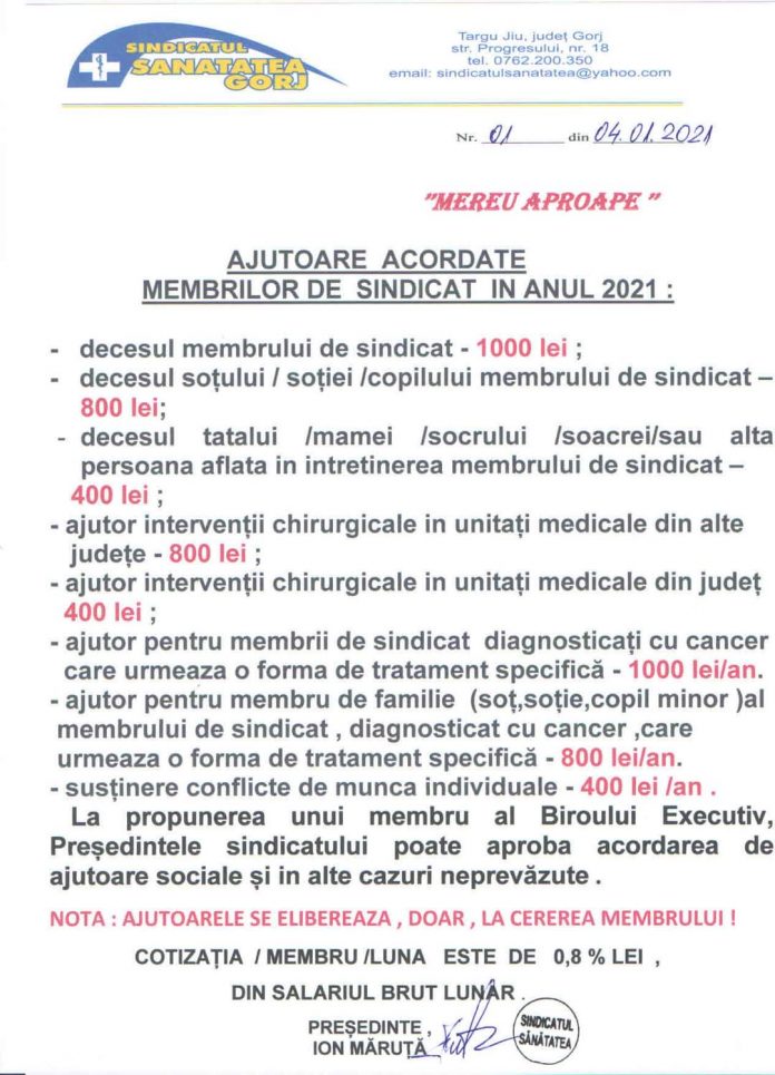 Ajutoarele acordate în 2021 membrilor Sindicatului Sănătatea Gorj