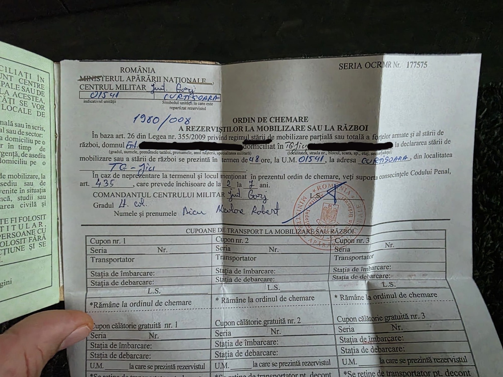 Documentele, emise în baza art. 26 din Legea 335/2009, îi obligă pe destinatari ca, în cazul declarării stării de mobilizare parțială sau a stării de război, să se prezinte în maximum 48 de ore la Unitatea Militară 01541 din Curtișoara.