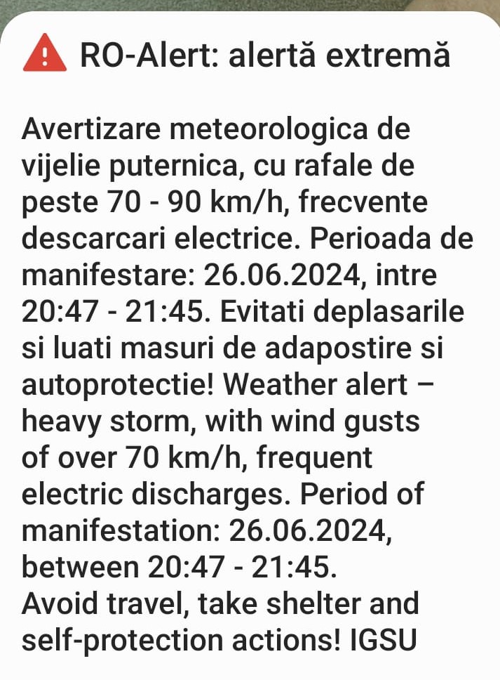 Târgujienii au primit în urmă cu câteva momente, în timpul meciului Slovacia-România, o avertizare imediată de vijelie puternică, prin aplicația RO-Alert