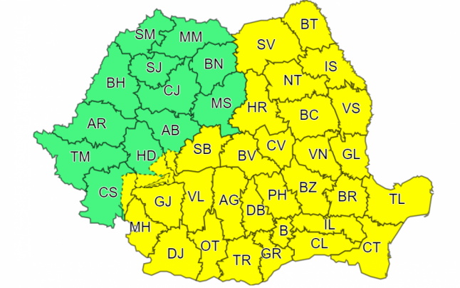 Meteorologii au emis marți o avertizare Cod galben de vânt și ploi valabilă în 31 de județe din țară. Sunt vizate județele Suceava, Botoșani, Iași, Neamț, Vaslui, Bacău, Vrancea, Galați, Buzău, Brăila, Tulcea, Constanța, Ialomița, Călărași, Giurgiu, Ilfov, Prahova, Dâmbovița, Teleorman, Argeș, Olt, Dolj, Vâlcea, Gorj, Mehedinți, Caraș-Severin, Hunedoara, Sibiu, Brașov, Covasna și Harghita.