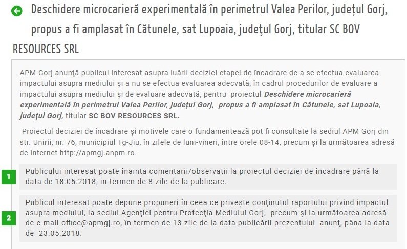 documentația necesară la Agenția pentru Protecția Mediului Gorj pentru a începe lucrările de exploatare a lignitului “pe Valea Perilor”. De fapt, microcariera respectivă ar urma să se înființeze în Lupoaia, la aproximativ 3 km de locația anunțată, oficial, de investitori. “Firma din Mehedinți nu a respectat punctele din acordul de mediu, în sensul că, în urma