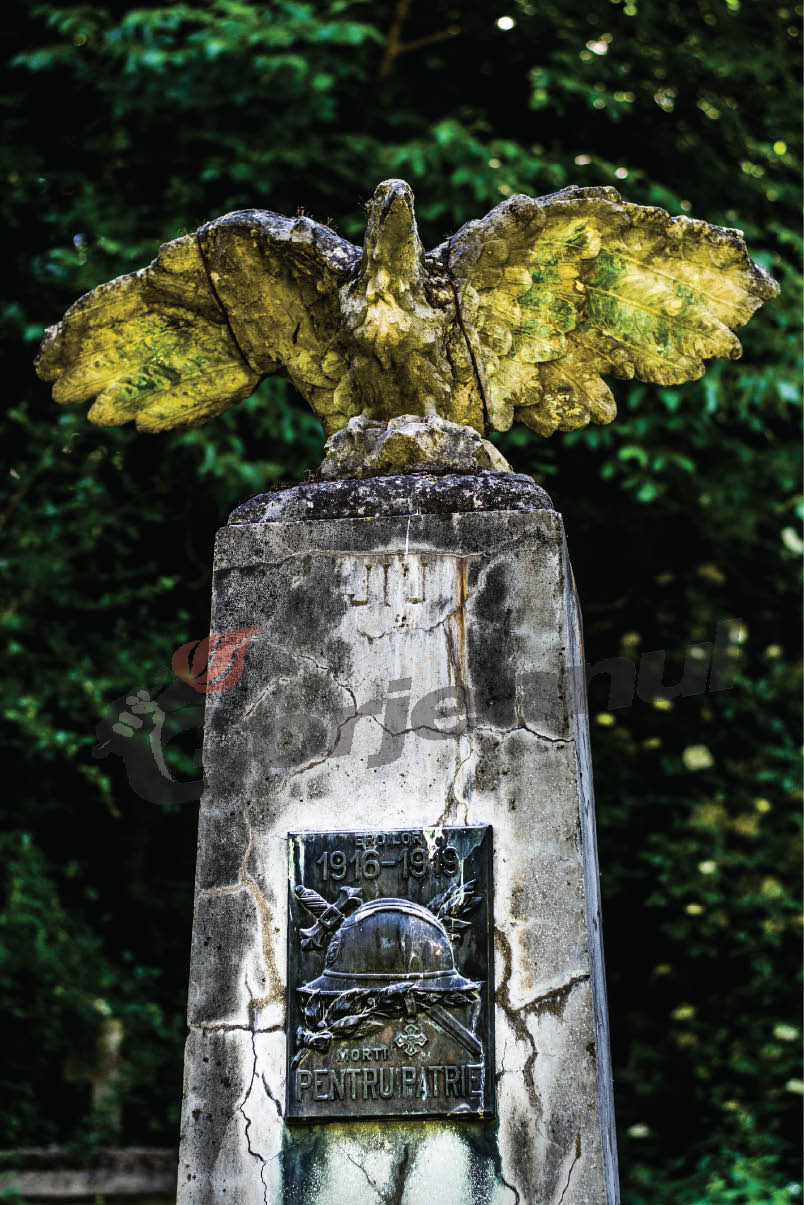 trecătorilor. Un vultur de piatră veghează aici memoria pilduitoare a gorjenilor ce s-au jertfit în luptele de la Jiu, Mărăști, Mărăşeşti şi Oituz, alături de „Semnul aducerii aminte”, dăltuit în bronz, credem noi, singurul păstrat pe teritoriul Gorjului. În apropiere, în curtea Bisericii „Sf. Petru şi Pavel” se află de asemenea o cruce veche de piatră pe care sunt trecuți eroii din 1916-1918, precum și alte câteva cruci ale eroilor din această comună, căzuţi la datorie în timpul celui de-al Doilea Război Mondial. I-am avut alături în această incursiune pe urmele eroilor din Dăneşti, pe domnul prof. Dorel Şorop, preşedinte al Cercului Cultul Eroilor din cadrul Şcolii Gimnaziale Nr. 1 Dăneşti şi domnul Ilarie Calotă, pensionar, pasionat de trecutul şi istoria acestor meleaguri.”
