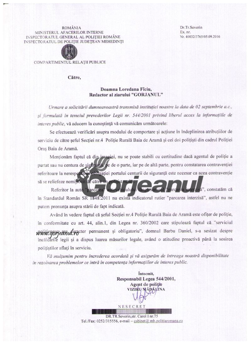 la nerespectarea obligației portului centurii de siguranță este necesar ca acea contravenție să se reliefeze în mod nemijlocit de către un polițist rutier. Se efectuează verificări asupra modului de comportare și acțiune în îndeplinirea atribuțiilor de serviciu de către șeful Secției Nr. 4 Poliție Rurală Baia de Aramă și cei doi polițiști din cadrul Poliției Oraș Baia de Aramă”, se precizează într-un comunicat de presă al IPJ Mehedinți, în urma unei solicitări a reporterilor Gorjeanul. La finalul comunicatului de presă, reprezentanții IPJ Mehedinți susțin însă că șeful Secției de Poliție Rurală Nr. 4 Baia de Aramă a acționat așa cum se cuvine la fața locului, după ce a fost filmat în timp ce le spune subalternilor, de pe marginea drumului, să-l încătușeze pe șofer. “Pune-i cătușele, odată, Cătăline! Voi nu știți cum se procedează? Vă învăț eu de aici?”, a spus acesta. “Având în vedere faptul că șeful Secției Nr. 4 Poliție Rurală Baia de Aramă este ofițer de Poliție, în conformitate cu art. 44, alin.1, din Legea nr.360/2002 care stipulează faptul că serviciul polițienesc are caracter permanent și obligatoriu, domnul Barbu Daniel s-a sesizat despre încălcările legii și a dispus luarea măsurilor legale, având o atitudine proactivă până la sosirea polițiștilor de serviciu”, a precizat Mădălina Viziru, purtătorul de cuvânt al IPJ Mehedinți.