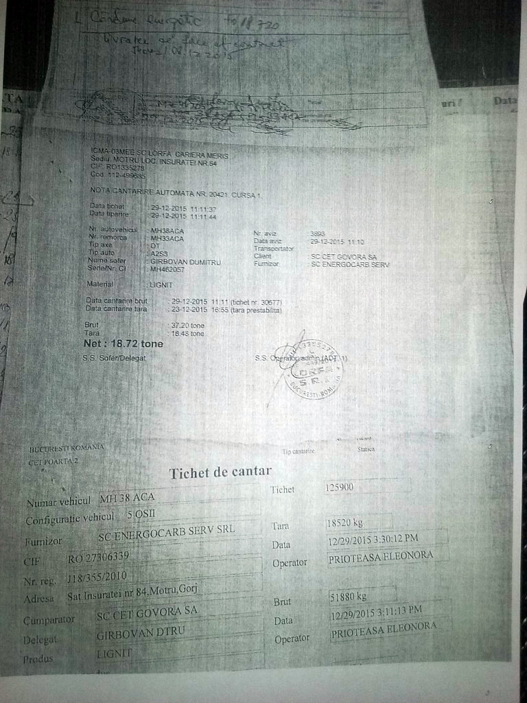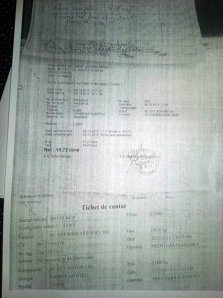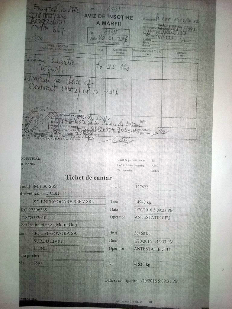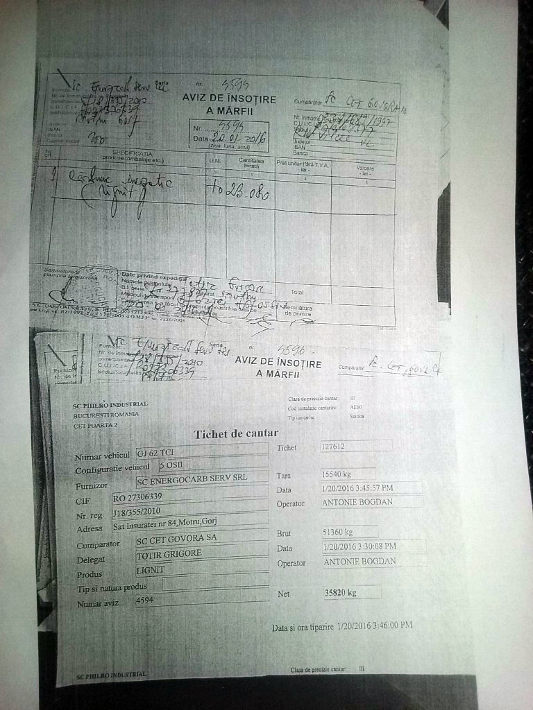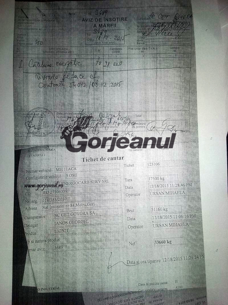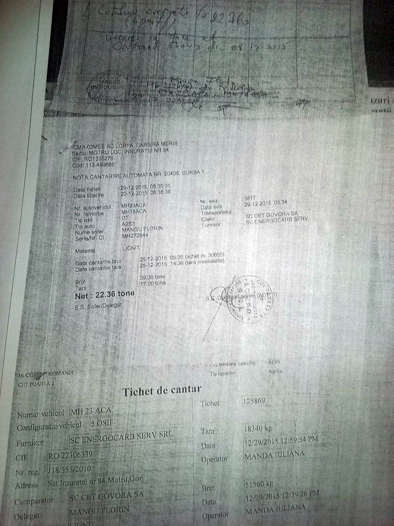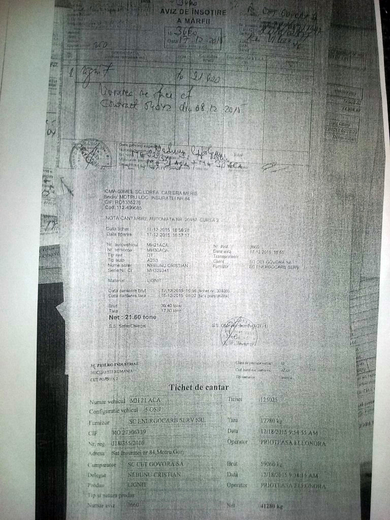 Un exemplu de fraudare crasă a statului este avizul de însoțire a mărfii nr. 3717 din 20.12.2015, emis de Energocarb, în care se arată că mașina cu nr. de înmatriculare MH50ACA, șofer Onea Daniel, pleacă de la Motru cu o încărcătură de 23,76 tone cărbune, aceeași cantitate este înregistrată și la Cariera Meriș – Motru – SC Lorfa SRL (de unde a furnizat Energocarb Serv cărbunele). La CET Govora, același camion, același transport, este înregistrat la cântărire cu: 40, 980 tone cărbune, semn că mașina se umple, din senin, în timp ce se afla în trafic, cu o cantitate dublă de cărbune. De asemenea, avizul de însoțire a mărfii nr. 3720 din 20.12.2015, emis de Energocarb, în care se arată că mașina cu nr. de înmatriculare MH27ACA, șofer Nebunu George, pleacă de la Motru cu o încărcătură de 23,58 tone cărbune, aceeași cantitate este înregistrată și la Cariera Meriș – Motru – SC Lorfa SRL (de unde a furnizat Energocarb Serv cărbunele). La CET Govora, același camion, același transport, este înregistrat la cântărire cu: 43,080 tone cărbune! Avizul de însoțire a mărfii nr. 3728 din 20.12.2015, emis de Energocarb, în care se arată că mașina cu nr. de înmatriculare GJ20SEV, șofer Olaru Gheorghe, pleacă de la Motru cu o încărcătură de 21,44 tone cărbune, aceeași cantitate este înregistrată și la Cariera Meriș – Motru – SC Lorfa SRL (de unde a furnizat Energocarb Serv cărbunele). La CET Govora, același camion, același transport, este înregistrat la cântărire cu: 37,160 tone cărbune! Mai mult, avizul de însoțire a mărfii nr. 3689 din 18.12.2015, emis de Energocarb, în care se arată că mașina cu nr. de înmatriculare MH11ACA, șofer Ianoș Georgel, pleacă de la Motru cu o încărcătură de 21 tone cărbune, aceeași cantitate este înregistrată și la Cariera Meriș – Motru – SC Lorfa SRL (de unde a furnizat Energocarb Serv cărbunele). La CET Govora, același camion, același transport, este înregistrat la cântărire cu: 33,660 tone cărbune, iar lista continuă.