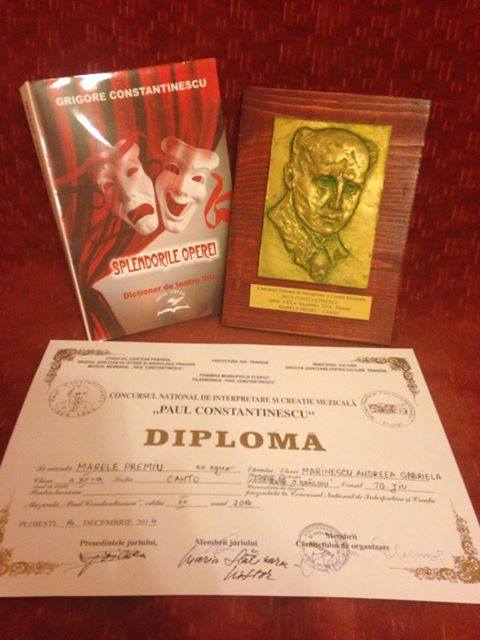 Andreea Marinescu, elevă a clasei a XII-a a Liceului de Arte ”Constantin Brăiloiu” din Târgu-Jiu, a participat la Ploiești, la cea de-a XX-a ediție a Concursului Național de Interpretare și Creație Muzicală ”Paul Constantinescu”, concurs care s-a desfășurat între 12-15 decembrie 2014, de unde s-a întors victorioasă, obținând Marele Premiu.