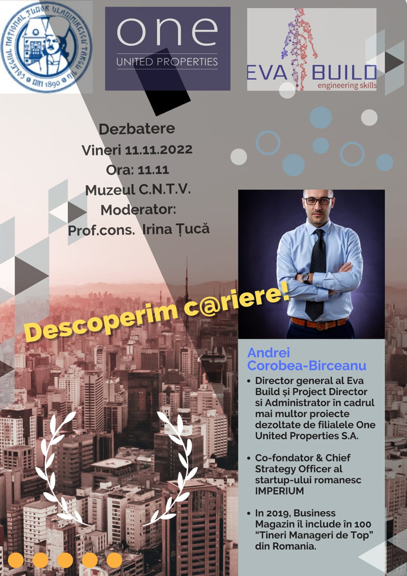 Colegiul National Tudor Vladimirescu din Târgu-Jiu va organiza vineri un eveniment de amploare intitulat ,,Descoperim cariere”. În cadrul dezbaterilor „Descoperim cariere!” specialiști de top din diverse domenii de activitate le vor împărtăși liceenilor C.N.T.V. informații despre experiența lor profesională, contribuind la realizarea unei colecţii unice de date şi imagini specifice diverselor profesii în scopul dezvoltării unui management eficient al propriei cariere. Evenimentul va avea loc în sala Muzeu „Iuliu Moisil” a Colegiului Național „Tudor Vladimirescu”. Aici, organizatorii anunță că cei prezenți vor putea sta de vorbă cu Andrei Corobea-Birceanu, un tânăr cu o vastă experiență profesională în gestionarea afacerilor, managementul și coordonarea dezvoltărilor rezidențiale, de birouri, comerciale și industriale, fiind implicat de-a lungul timpului în investiții provocatoare în București atât din sectorul Real Estate, cât și din domenii diferite.