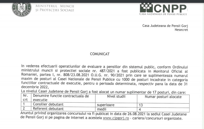 Casa Județeană de Pensii Gorj va angaja 17 persoane pe perioadă determinată. Chiar şi cei fără experienţă pot participa la selecţie, dacă au abilităţi şi competenţe pentru a lucra la procesul de evaluare și digitalizare a dosarelor de pensie.