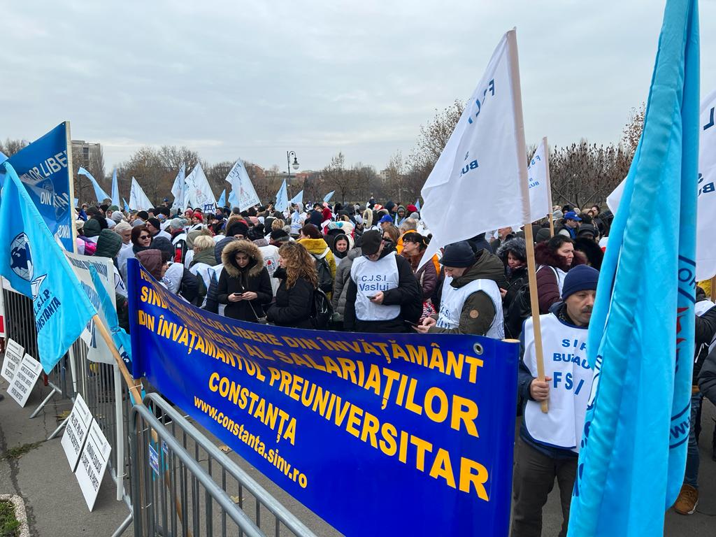 Sute de angajați din sistemul de educație au protestat, miercuri, în fața Parlamentului. „Această acțiune de protest face parte din seria protestelor care au fost demarate în întreaga țară și care vor continua și în zilele următoare”, a anunțat Federația Sindicatelor Libere din Învățământ (FSLI).