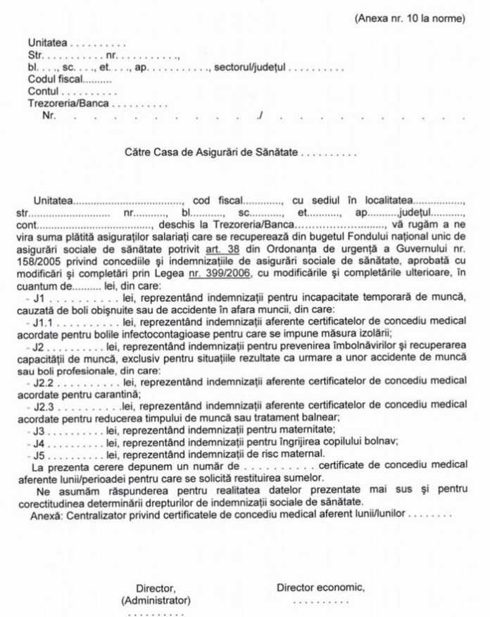 ,,Urmare a publicării în Monitorul Oficial, partea I nr. 708 din 06 august 2020 a Ordinului nr. 1395/830/2020 pentru modificarea și completarea Normelor de aplicare a prevederilor Ordonanței de urgență a Guvernului nr. 158/2005 privind concediile și indemnizațiile de asigurări sociale de sănătate, aprobate prin Ordinul ministrului Sănătății și al președintelui Casei Naționale de Asigurări de Sănătate nr. 15/2018/1.311/2017, aducem în atenția agenților economici, plătitori de indemnizații de asigurări sociale de sănătate, mai multe modificări legislative. Certificatele de concediu medical prevăzute la alin. (4), care au fost transmise prin mijloace de transmitere la distantă, constituie documente justificative de plată, formularele originale ale certificatelor de concediu medical, respectiv exemplarele 1 (alb) și 2 (roz) se depun de către persoana asigurată la plătitorii de indemnizații de asigurări sociale de sănătate în termen de 30 de zile calendaristice de la data eliberării acestora. În cazul în care după verificarea datelor se constată neconcordanțe care implică rectificarea datelor și/sau a sumelor cuprinse în declarația inițială, în termen de maximum 30 de zile, casele de asigurări de sănătate vor transmite angajatorilor sau asimilaților acestora o notificare, pe suport hârtie sau prin mijloace de transmitere la distanță. Dacă după analizarea cererii și a certificatelor de concediu medical cuprinse în borderoul centralizator, se constată că sunt certificate medicale care nu îndeplinesc condițiile de legalitate și conformitate, sumele reprezentând indemnizațiile aferente acestor certificate vor fi respinse la plată. După remedierea cauzelor înscrise în comunicarea transmisă agenților economici care au condus la respingerea plății totale/parțiale a sumelor solicitate, angajatorul poate depune o nouă cerere conform modelului prevăzut în anexa 10, în termen de 90 de zile de la data primirii comunicării plătitorii de indemnizații de asigurări sociale de sănătate au obligația să elibereze asiguratului adeverințe, pe suport hârtie sau prin mijloace de transmitere la distanță, din care să rezulte numărul de zile de concediu medical pentru incapacitate temporară de muncă avute în ultimele 12/24 de luni, după caz, conform modelului prevăzut în anexa nr. 7. Dacă durata perioadei de carantină depășește 90 de zile, pentru aceste certificate de concediu medical nu este necesar avizul medicului expert al asigurărilor sociale”, a transmis conducerea CAS Gorj.Începând cu data de 10 august 2020 cererea de recuperare a indemnizațiilor de concedii medicale depusă de agenții economici este conform modelului atașat prevăzut în anexa 10.
