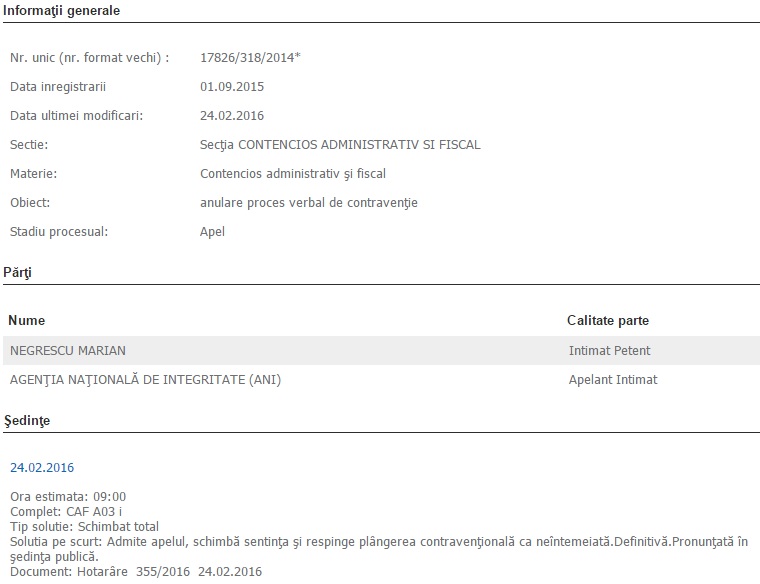 De Dragobete, Marian Negrescu a primit o adevărată lovitură financiară la Tribunalul Gorj, el pierzând apelul în procesul cu ANI, înregistrat pe rolul acestei instanțe în luna septembrie. Negrescu, potrivit sentinței de miercuri, este obligat să plătească contravenția stabilită de ANI, sentința fiind definitivă. Negrescu ceruse, pe fond, anularea procesului verbal de contravenție și primise chiar și o sentință favorabilă în acest sens. Bucuria i-a fost însă de scurtă durată, deoarece acum este bun de plată că ANI, cu atât mai mult cu cât dosarul său penal cu Agenția, pe conflict de interese, va fi soluționat de Curtea de Apel Craiova pe 3 martie.