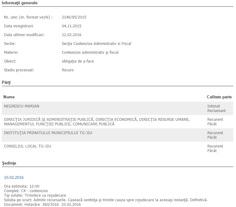 În acest dosar în care sentința s-a pronunțat pe 10 februarie Negrescu a pierdut cu brio procesul în care și-a permis să dea în judecată atât pe primarul municipiului, cât și Consiliul Local dar și trei direcții ale primăriei.