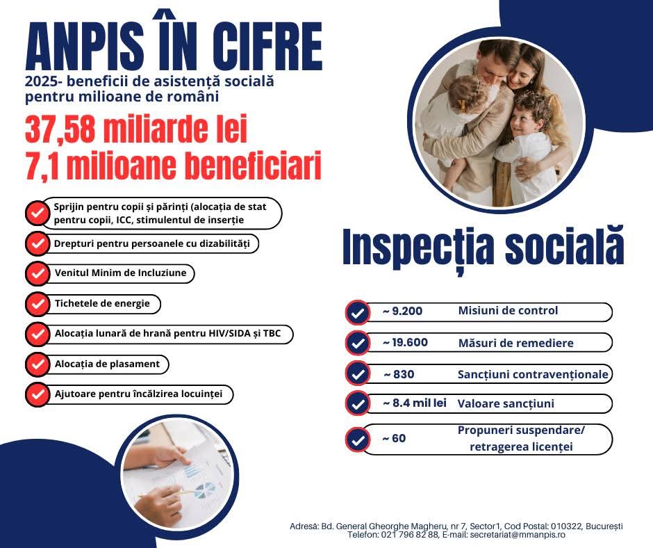 În 2025, ANPIS a asigurat plata beneficiilor sociale pentru aproximativ 7,1 milioane de români lunar, cu un total de 37,58 miliarde lei, comparativ cu 36,79 miliarde lei în 2024, când beneficiarii au fost 6,4 milioane lunar.
