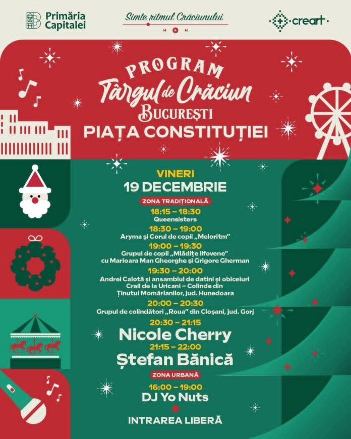 Între orele 20:00 și 20:30, în zona tradițională a evenimentului, colindătorii gorjeni vor aduce în fața publicului colinde autentice și obiceiuri specifice satului Cloșani, județul Gorj.
