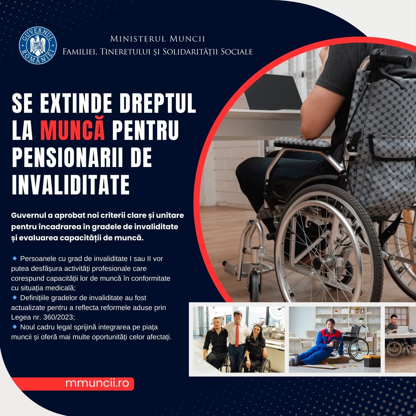 Se extinde dreptul la muncă pentru pensionarii de invaliditate! Guvernul a aprobat noi criterii clare și unitare pentru încadrarea în gradele de invaliditate și evaluarea capacității de muncă.