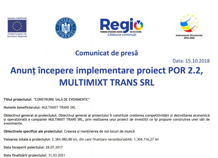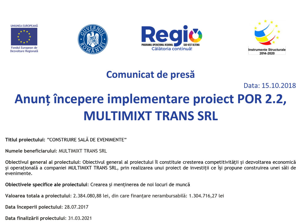 Obiectivul general al proiectului: Obiectivul general al proiectului îl constituie cresterea competitivității și dezvoltarea economică și operațională a companiei MULTIMIXT TRANS SRL, prin realizarea unui proiect de investiții ce își propune construirea unei săli de evenimente.