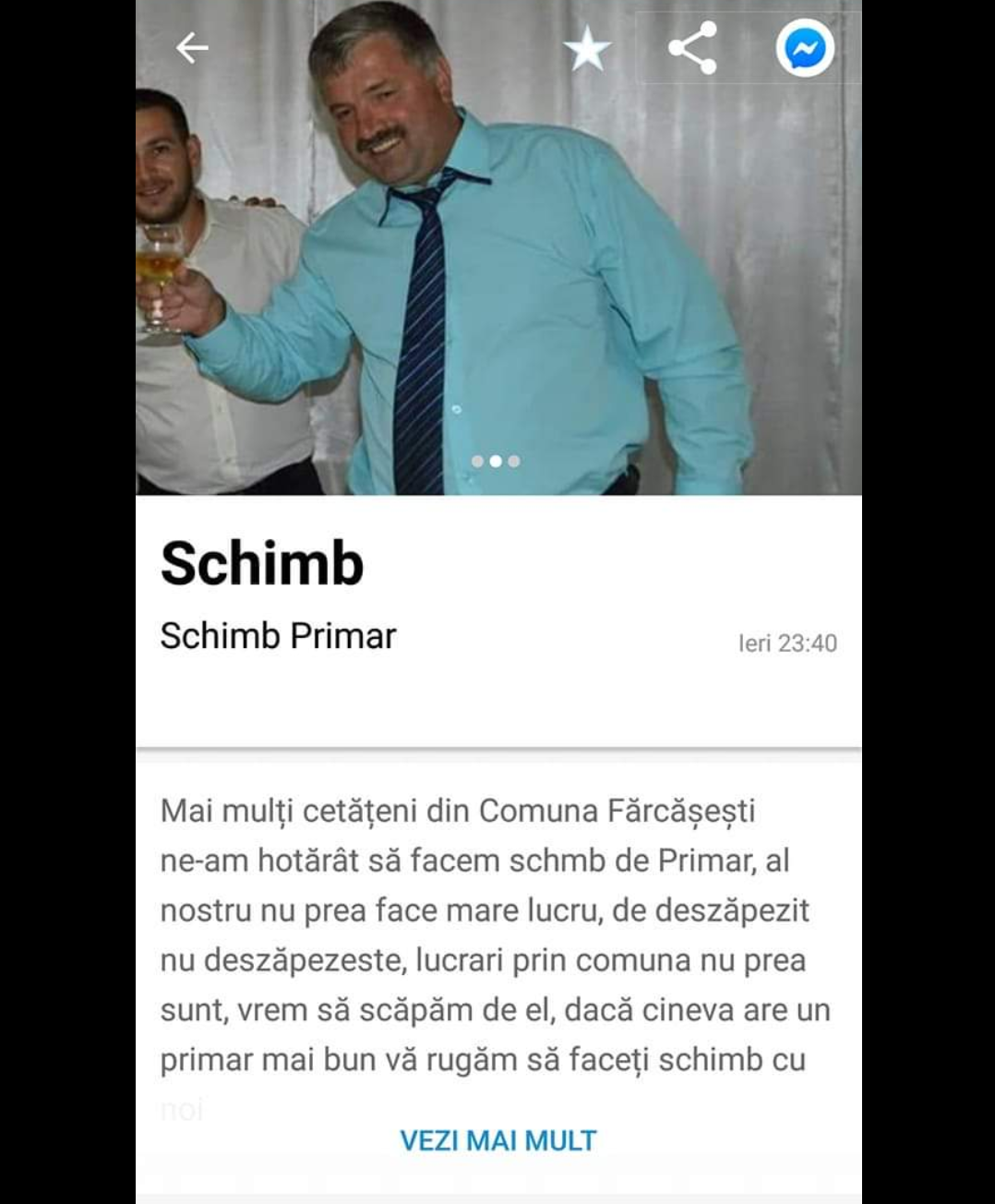 Un anunț atipic a fost postat ieri pe OLX de un cetățean din Gorj. Anunțul sună cam așa: ,,Mai mulți cetățeni din comuna Fărcășești ne-am hotărât să facem schimb de Primar, al nostru nu prea face mare lucru, de deszăpezit nu deszăpezește, lucrări prin comună nu prea sunt, vrem să scăpăm de el. Dacă cineva are un primar mai bun vă rugăm să faceți schimb cu al nostru,,. Anunțul de pe OLX este postat la rubrica ,,schimb cu orice,,.