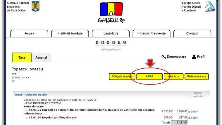 La apăsarea butonului „Afișare obligații restante, se afișează lista obligațiilor ce pot fi plătite prin platforma ghiseul.ro, și care cuprinde peste 30 de poziții, de la impozitul pe venituri, la contribuții, accize colectate și până la plata unor penalități.