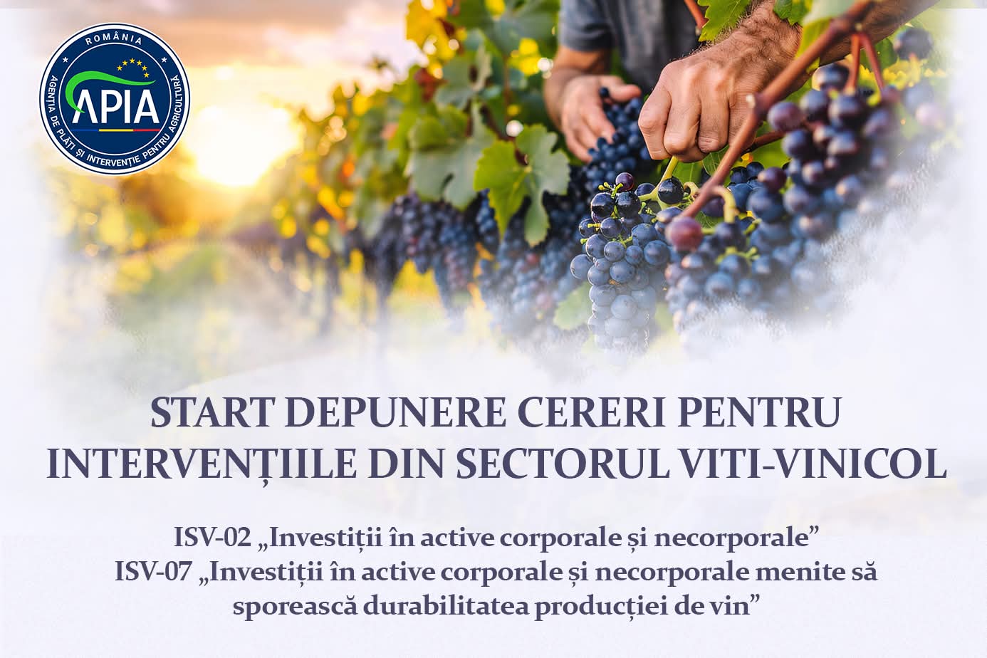Agenția de Plăți și Intervenție pentru Agricultură informează potențialii beneficiari ai intervențiilor ISV-02 „Investiții în active corporale și necorporale” și ISV-07 „Investiții în active corporale și necorporale menite să sporească durabilitatea producției de vin” din cadrul Planului Strategic PAC 2023-2027, că pe site-ul oficial APIA a fost publicat link-ul de acces pentru aplicația destinată introducerii și transmiterii Cererilor de Finanțare: https://portalinvestitii.apia.org.ro/.
