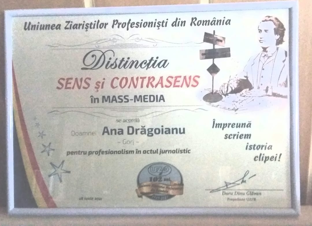 Any Drăgoianu, membră a Filialei UZPR „Tudor Arghezi” Craiova, a participat cu 10 articole (În același sens, Sens pe contrasens, Scenarii, Derapaje, Filosofia stărilor sau starea filosofiilor, Din vremea pandemiei (I, II și III), Coronavirusul în prelungiri și Coronavirusul), publicate pe parcursul anului 2020 în Cotidianul „Gorjeanul”, „Informația de Strehaia” și ziarul „Linia Întâi”, și a obținut Distincția „SENS și CONTRASENS” în MASS-MEDIA pentru profesionalism și actul jurnalistic, acordată de UZPR.