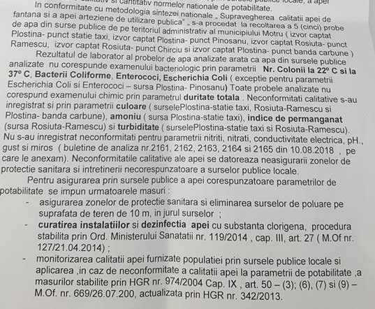 neconformă. Mai exact, în apă s-a depistat E-Coli, enterococi și bacterii coliforme, mai puțin din sursa Pinoșanu-Ploștina. În rest, toate probele nu corespund examenului chimic privind duritatea apei, culoarea(asta mai ales din sursa aflată lângă banda de cărbune), amoniu și turbiditatea. Autoritățile din Motru sunt obligate să informeze populația în vederea neconsumării apei respective atât din fântâni publice, cât și private, dar și să îndepărteze sursele de populare. Apele infestate trebuie, de asemenea, curățate, instalațiile de furnizare a apei în special, iar apa dezinfectată. De altfel, în ambele localități ar fi 100 de gospodării afectate, ieri, locuitorii neștiind că nu mai au voie să consume apa respectivă.