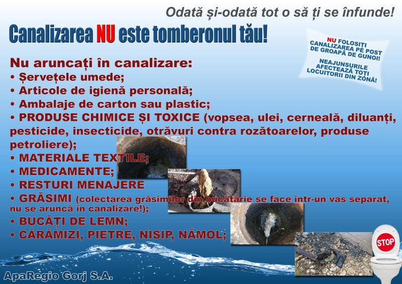 Deşeurile menajere nu trebuie aruncate în toaletă/wc pentru că vor avea de suferit instalaţiile de canalizare, conductele, dar şi staţiile de pompare a apei. ,,Utilizarea necorespunzătoare a acestora ne afectează pe toţi. Durata de viaţă a instalaţiilor scade, costurile de întreţinere şi operare cresc, iar toate acestea sunt suportate de către toţi membrii comunităţii. Echipele operatorului de apă și canal au efectuat în luna martie 2020, lucrări de decolmatare a canalizării în mai multe zone din municipiul Târgu-Jiu: Castanilor, I. B. Deleanu, Victoria, Mihail Kogălniceanu, Dacia, Olteniței, Tudor Arghezi, Lt. Col. Dumitru Petrescu, A. I. Cuza, Teilor, Plopilor, Iezureni, Mărășești. Pe această cale, Aparegio Gorj face apel către cetățeni să nu mai arunce în canalizare resturi menajere, materiale textile, șervețele umede, produse de igienă intimă, bucăți de plastic sau lemn, grăsimi etc. Aceste materiale se depun pe pereții interni ai conductelor facilitând depunerile și împiedicând scurgerea apelor. De asemenea, pe toată perioada pandemiei cu COVID-19 (SARS-COV-2) măștile și mănușile de protecție să nu se arunce în vasul de toaletă”, au transmis reprezentanții Aparegio Gorj. Pentru orice disfunc-ționalitate a rețelelor de alimentare cu apă sau de canalizare(la limita de proprietate), puteți apela dispeceratul central al societății – telefon 0253/920, serviciu disponibil 24 de ore din 24, 7 zile pe săptămână. În anul 2016, Aparegio Gorj a demarat o campanie de conştientizare a populaţiei asupra efectelor pe care le are aruncarea deşeurilor în sistemul de canalizare «Odată și-odată o să ți se înfunde! Canalizarea NU este tomberonul tău!».