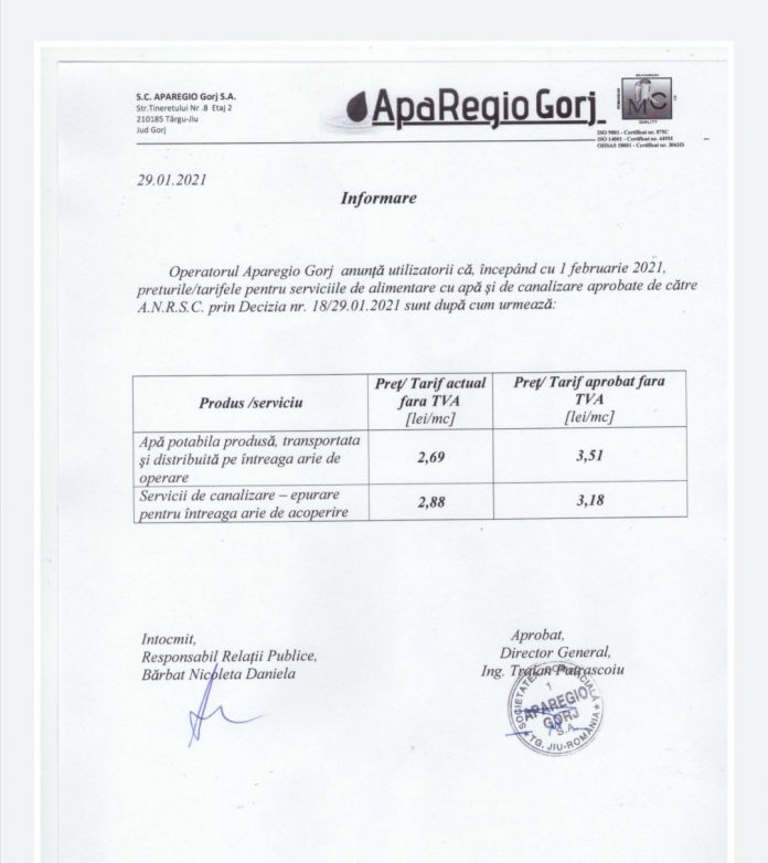 Aparegio: Prețuri noi la serviciile de apă-canal, valabile de la 1 februarie