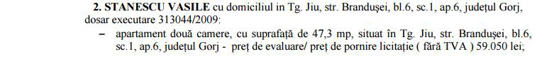 Scos iar la licitaţie de Finanţele Publice Gorj, pe 18 septembrie, apartamentul interpretei Niculina Stoican şi a soţului acesteia, Vasile Stănescu, situat în Târgu-Jiu pe strada Brânduşei, riscă să se vândă mai pe nimic. Preţul a scăzut deja cu 20%, imobilul cu două camere fiind licitat cu un preţ de pornire de doar 59.050 de lei, deşi la prima strigare preţul acestuia se apropia de 90.000 de lei. Apartamentul, vândut la preţ de garsonieră confort doi, nu atrage însă nici astfel cumpărători, asta deoarece cei interesaţi trebuie să aibă toţi banii şi să şi achite o garanţie, în momentul în care cei interesaţi participă la licitaţie. Reamintim că proprietarul apartamentului, în acte, este Vasile Stănescu, soţul Niculinei Stoican Stănescu, aflat în detenţie într-un penitenciar din Mehedinţi.