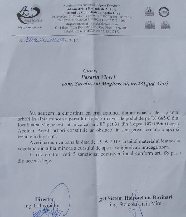 De curând, pe adresa domnului Viorel Păsărin, pensionar din satul Magherești, comuna Săcelu, a sosit o somație din partea Administrației Apele Române Gorj, în care i se solicită “să taie materialul lemnos și vegetația din albia minoră a cursului de apă Turbați, în aval de podul de pe drumul județean 665 C, și să igienizeze întreaga zonă” fiindcă, în caz contrar, va fi sancționat contravențional.