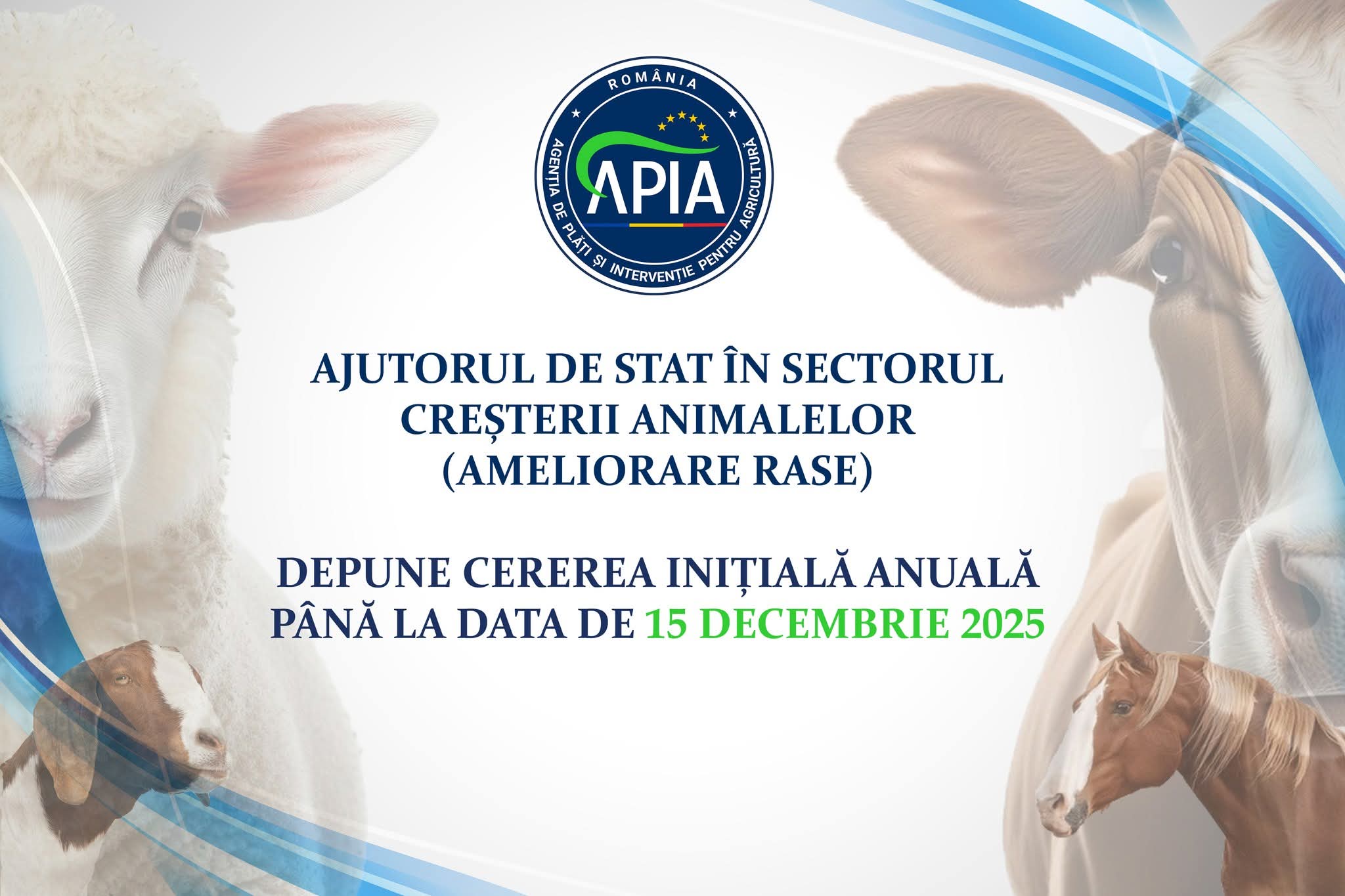 Agenţia de Plăţi şi Intervenţie pentru Agricultură (APIA) primește, până la data de 15 decembrie 2025 inclusiv, cererile iniţiale anuale de solicitare a ajutorului de stat în sectorul creşterii animalelor pentru anul 2026, cereri ce trebuie avizate în prealabil de către ANZ.