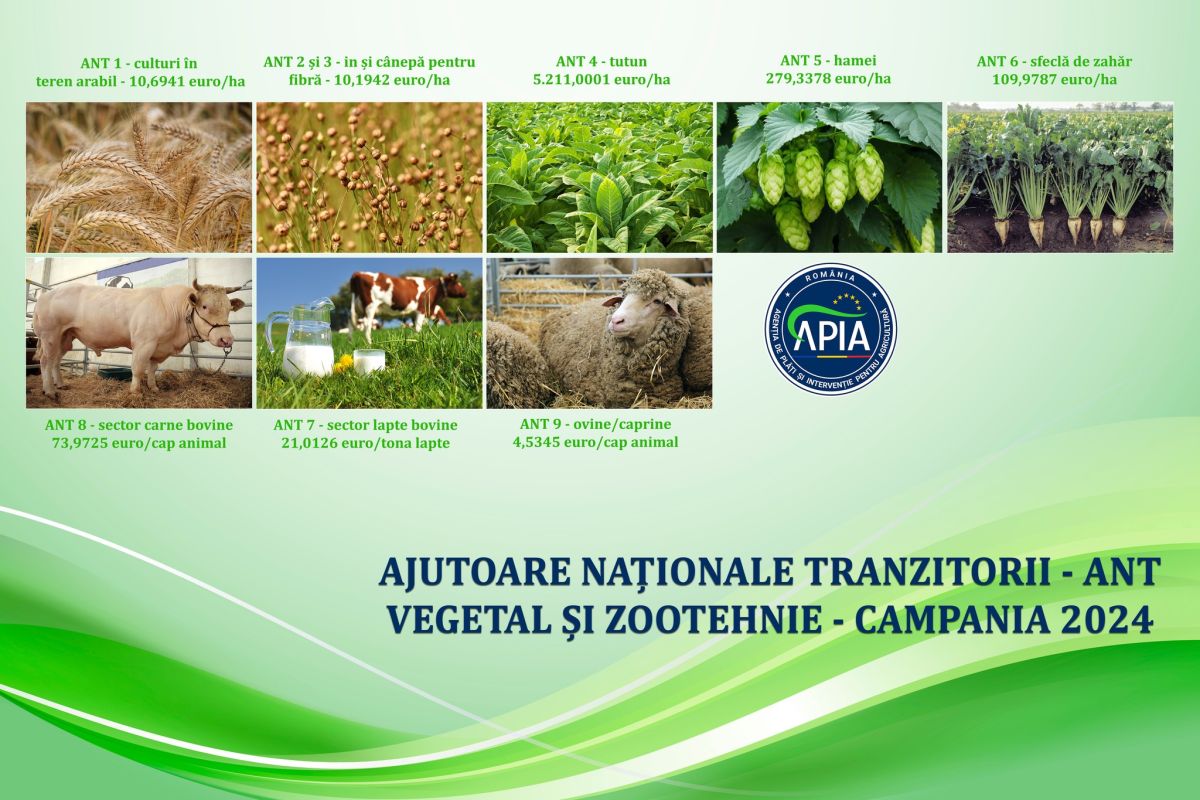 Agenţia de Plăţi şi Intervenţie pentru Agricultură (APIA) informează că a demarat autorizarea la plată a Ajutoarelor Naţionale Tranzitorii (ANT) aferente sectoarelor vegetal și zootehnic, pentru anul de cerere 2024.