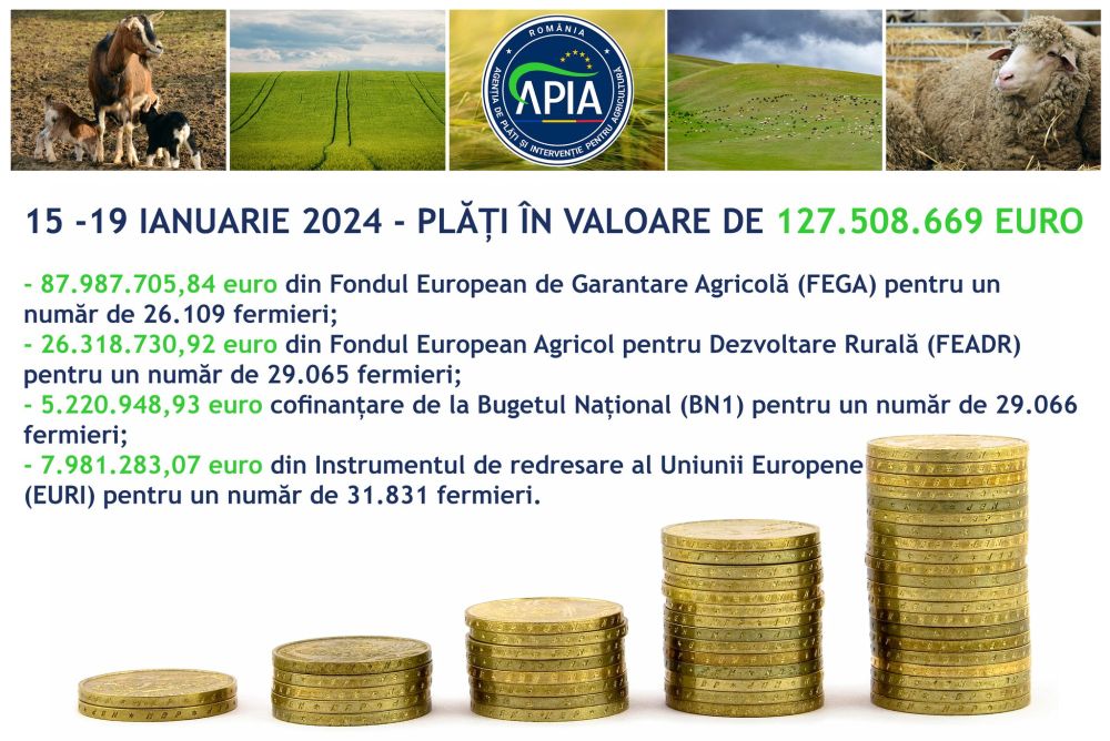 Agenția de Plăți și Intervenție pentru Agricultură (APIA) informează că, în perioada 15 – 19 ianuarie 2024, a efectuat plăți pentru anul de cerere 2023 în suma totală de 127.508.669 euro, astfel: 87.987.705,84 euro din Fondul European de Garantare Agricolă (FEGA) pentru un număr de 26.109 fermieri; 26.318.730,92 euro din Fondul European Agricol pentru Dezvoltare Rurală (FEADR) pentru un număr de 29.065 fermieri; 5.220.948,93 euro cofinanțare de la Bugetul Național (BN1) pentru un număr de 29.066 fermieri; 7.981.283,07 euro din Instrumentul de redresare al Uniunii Europene (EURI) pentru un număr de 31.831 fermieri.