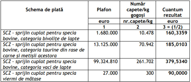 Agenţia de Plăţi şi Intervenţie pentru Agricultură (APIA) informează că au fost stabilite cuantumurile aferente sprijinului cuplat în sectorul zootehnic (SCZ), pentru anul de cerere 2020, urmând să fie demarat procesul de autorizare la plată a acestor scheme. În conformitate cu prevederile art.1 alin (1) și (2) din Hotărârea de Guvern nr.1104/17.12.2020 pentru aprobarea plafoanelor alocate schemelor de sprijin cuplat în sectorul zootehnic, precum şi pentru stabilirea cuantumului acestora pentru anul de cerere 2020, publicată în Monitorul Oficial nr.1258/din data de 18 decembrie 2020, în imaginea anexată fiind cuantumul per unitate pentru schemele de sprijin cuplat în sectorul zootehnic, calculat prin raportarea plafoanelor alocate la efectivul de animale eligibile, respectiv la kilogramele de gogoși crude de mătase eligibile. Plățile se efectuează în lei, la un curs de schimb de 4,8725 lei pentru un euro, stabilit de Banca Centrală Europeană la data de 30 septembrie 2020 și publicat în Jurnalul Oficial al Uniunii Europene, seria C, nr.323 din 1 octombrie 2020.