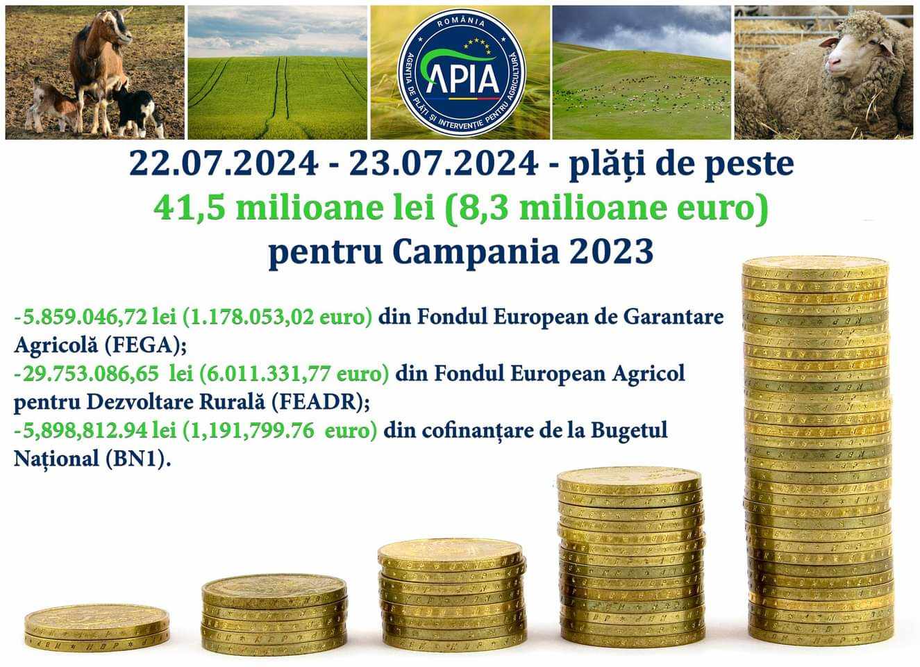 Agenția de Plăți și Intervenție pentru Agricultură (APIA) a efectuat, în perioada 22 -23.07.2024, plăți pentru anul de cerere 2023 în sumă totală 41.510.946,31 lei (8.381.184,55 euro), astfel: 5.859.046,72 lei (1.178.053,02 euro) din Fondul European de Garantare Agricolă (FEGA); 29.753.086,65  lei (6.011.331,77 euro) din Fondul European Agricol pentru Dezvoltare Rurală (FEADR); 5,898,812.94 lei (1,191,799.76 euro) din cofinanțare de la Bugetul Național (BN1).